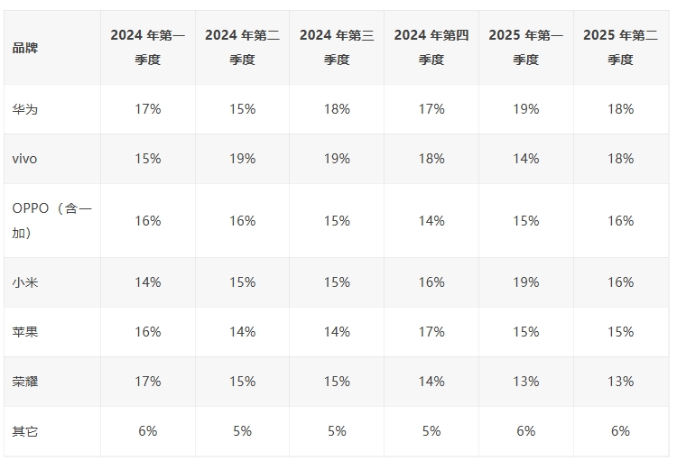 CounterPoint 報(bào)告 2025Q2 中國(guó)手機(jī)出貨量:華為、vivo 均占 18%、OPPO、小米均占 16%