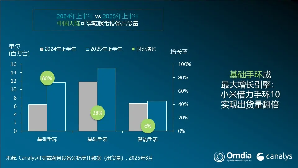 9 月 10 日消息,市場(chǎng)調(diào)查機(jī)構(gòu) Canalys 今天(9 月 10 日)發(fā)布博文,稱 2025 年上半年中國大陸可穿戴腕帶設(shè)備出貨量達(dá) 3390 萬臺(tái),同比增長 36%,繼 2024 年下半年 33% 的增長后持續(xù)強(qiáng)勢(shì)攀升,創(chuàng)歷史新高。