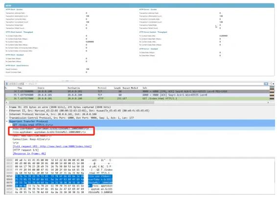 • 儀表統(tǒng)計顯示所有業(yè)務(wù)會話均建立成功,抓包顯示http報文攜帶正確的令牌