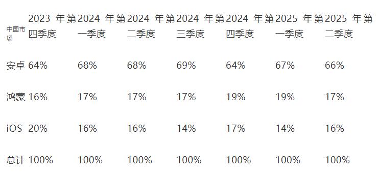 附上 2023 年第 4 季度到 2025 年第 2 季度中國(guó)手機(jī)系統(tǒng)分布圖表如下: