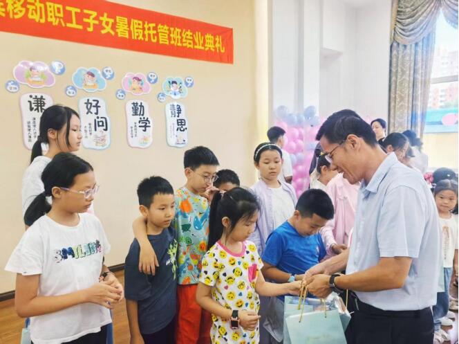 畢業(yè)典禮現(xiàn)場充滿童趣與溫情,哈爾濱移動工會主席為每個孩子送上了一份開學禮物并發(fā)表致辭,回顧了托管期間的點點滴滴。他提到,本次托管班圍繞“安全、快樂、成長”三大核心,不僅為孩子們安排了作業(yè)輔導、興趣拓展、趣味運動等活動,還讓孩子們在輕松氛圍中收獲知識、結(jié)交伙伴、提升能力。