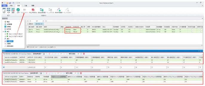 配置AS協(xié)議并點(diǎn)擊完成,在配置導(dǎo)航欄中可看到生成的AS協(xié)議,點(diǎn)擊啟動(dòng)所有協(xié)議,能看到測(cè)試儀Telkerd端口AS時(shí)鐘狀態(tài)為Slave,Listener端口AS時(shí)鐘狀態(tài)為Master,統(tǒng)計(jì)中能看到時(shí)間偏移量及協(xié)議包交互數(shù)量均正常,時(shí)間同步是Qbv調(diào)度基準(zhǔn)時(shí)間的基石,需優(yōu)先確保其建立成功。