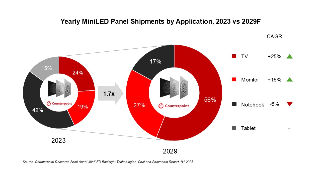 在平板領(lǐng)域,Mini LED 曾在 2022 年達(dá)到最高滲透率,但隨著 iPad Pro 改用 OLED 面板,預(yù)計(jì) 2025 年后該市場(chǎng)將歸零。