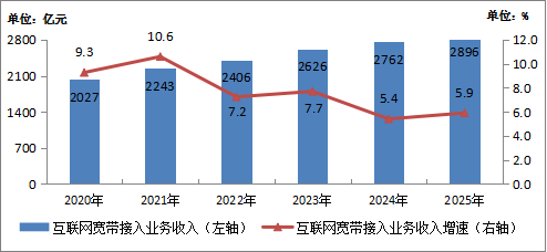圖1-2  2020—2025年互聯(lián)網寬帶接入業(yè)務收入情況