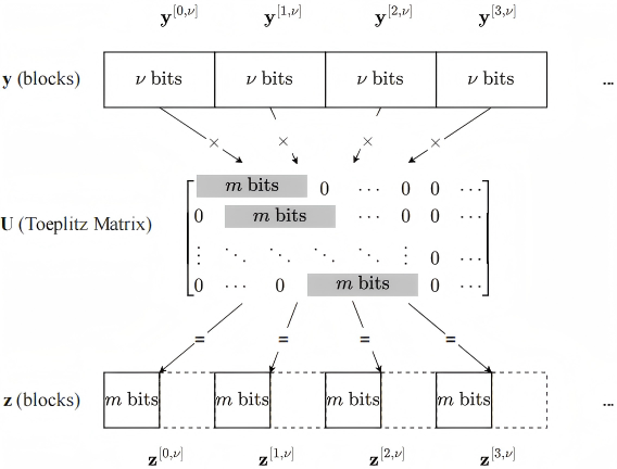 團隊通過研究提出了首個針對HQC解封裝(Decapsulation)過程中DPA式的攻擊方法。通過統(tǒng)計分析,成功鎖定了HQC解密過程中的一個關鍵中間值v⊕(uy)的漢明重量。為了完成攻擊,設計了一種巧妙的“局部投影”(Toeplitz based Local Projections)方法,通過構造特定的u多項式,使其在與密鑰y進行乘法運算時,能起到類似“窗口”的作用。這種特殊的構造確保了每一個小塊的輸出中間值,其依賴的密鑰位也被嚴格限制在一個對應的小塊內。通過這種方式,成功地將原本復雜的循環(huán)卷積問題,分解為一系列可以獨立、并行DPA攻擊的“塊狀”問題,極大地提高了攻擊的效率和可行性。