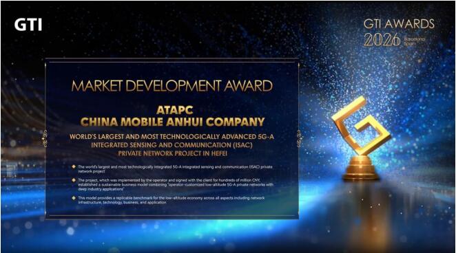 近日,在MWC2026巴塞羅那世界移動通信大會期間,由安徽移動聯(lián)合國際先進技術(shù)應(yīng)用推進中心(合肥)(簡稱國先中心)打造的合肥5G-A通感一體(ISAC)專網(wǎng)項目,成功斬獲GTI Awards 2026“市場發(fā)展獎”。這一獎項是對安徽移動和國先中心在5G-A技術(shù)創(chuàng)新、低空經(jīng)濟產(chǎn)業(yè)落地及商業(yè)生態(tài)構(gòu)建方面突出貢獻的高度認可,也標(biāo)志著我國5G-A賦能低空經(jīng)濟的“合肥模式”走向全球,成為國際低空智聯(lián)發(fā)展的標(biāo)桿。